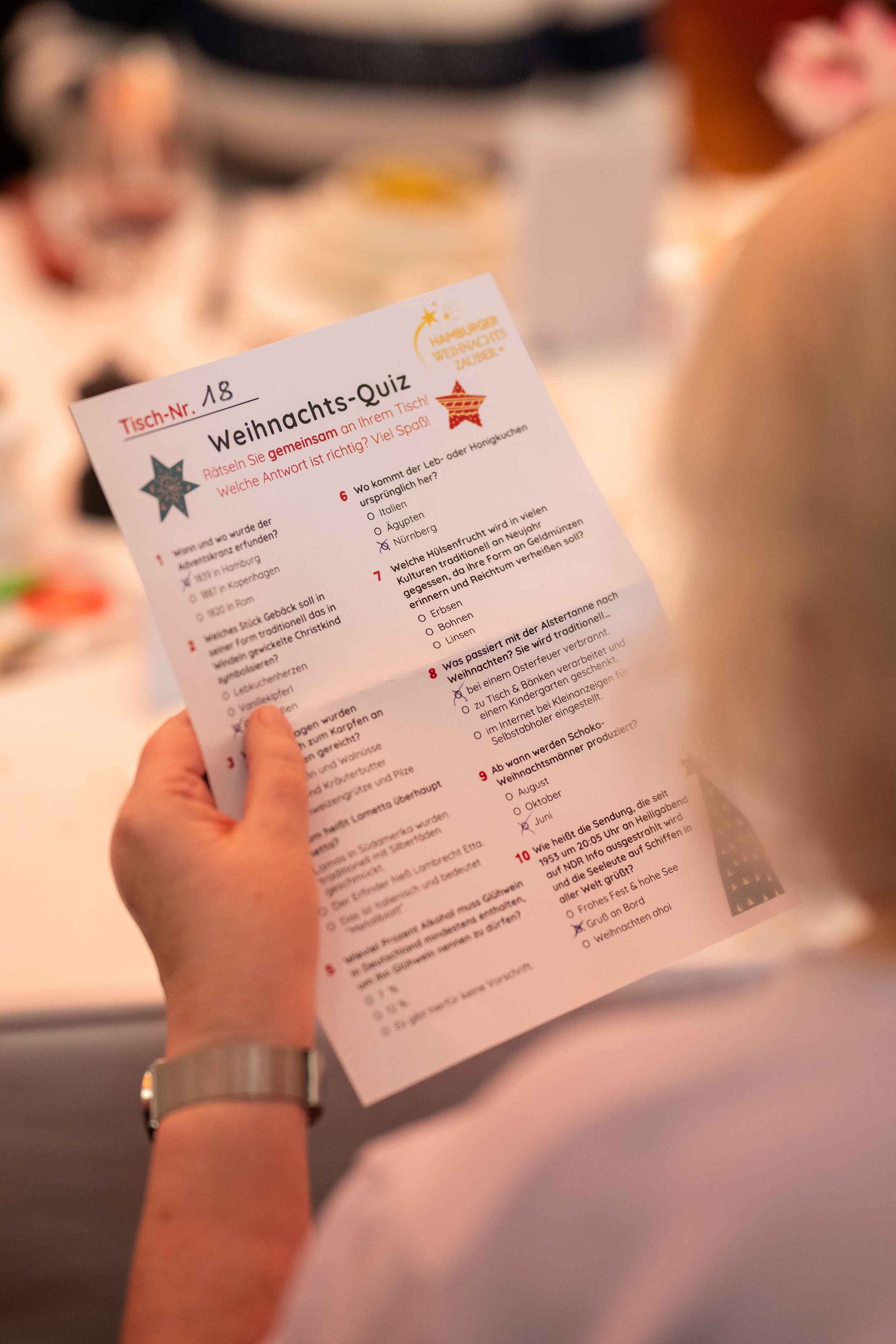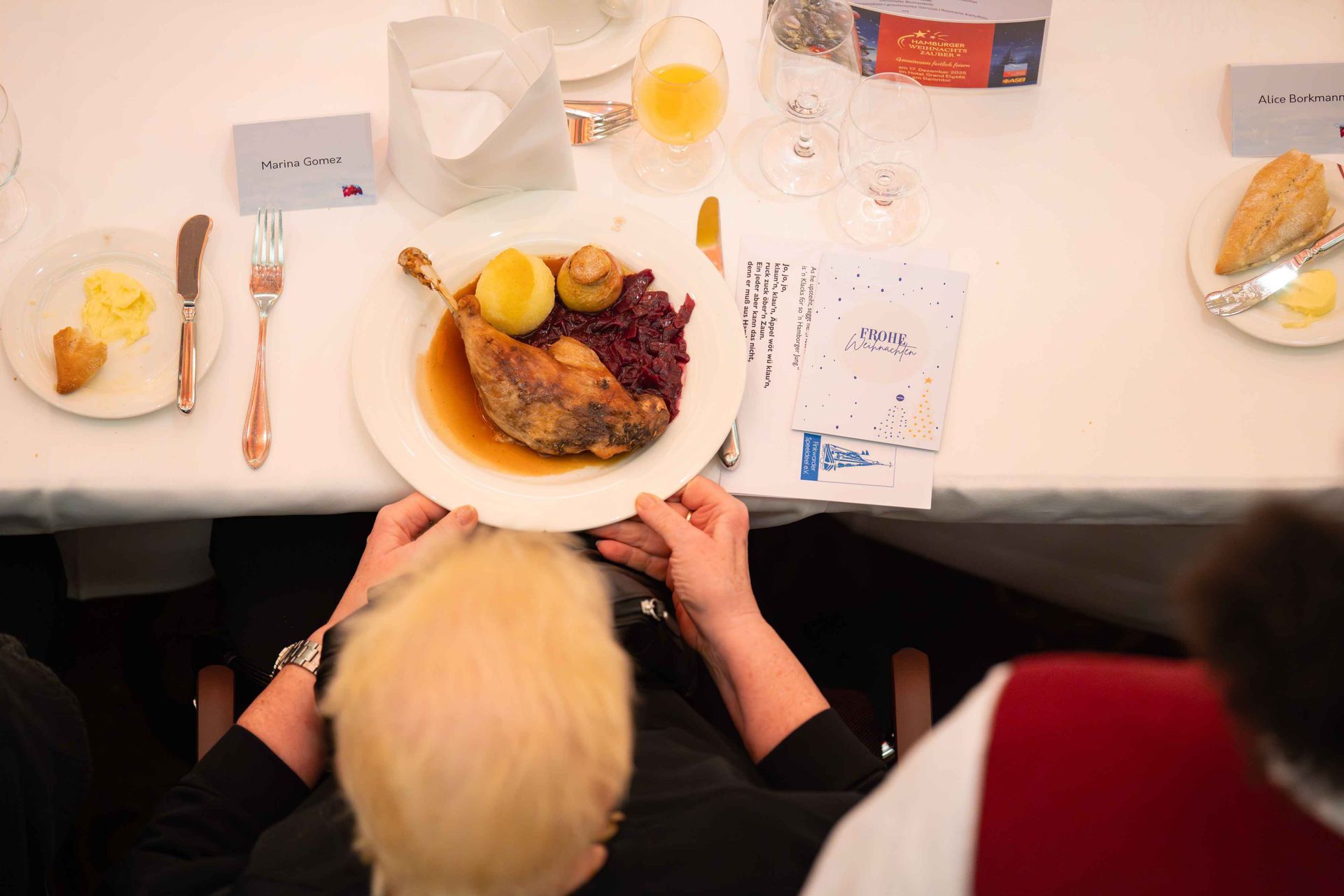 Unsere Gäste wurden von ihren Tischpaten an weihnachtlich dekorierten Stadtteil-Tischen in Empfang genommen und konnten so gleich zu Beginn mit Menschen aus ihrer Nachbarschaft ins Gespräch kommen, zum Beispiel beim gemeinsamen Weihnachts-Quiz. Nachdem erste Kontakte geknüpft waren, wurde ein köstliches Drei-Gänge-Menü serviert. Zu den weiteren Höhepunkten des festlichen Tages zählten die Künstlerin Jeannine Platz mit ihrer kunstvollen Gestaltung von Weihnachtskugeln, eine weihnachtliche Lesung und der Auftritt des Chors Lütt Finkwarder Speeldeel. Und zum Abschluss durfte natürlich die Bescherung nicht fehlen – alle Gäste erhielten vom Verein „Hamburger Abendblatt hilft e. V.“ ein Weihnachtspäckchen.